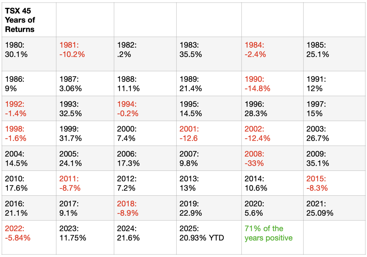 Even if you go back 100 years, you would see that the TSX has been positive more than 70% of the time.