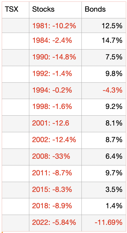 The reverse is true as well, in that bonds will perform poorly when stocks are up. The good thing about bonds is that they don't tend to be negative (other than 2022, where both bonds and stocks declined in the same year). Bonds have a yield that may produce 2-4%/year. It's important to hold some bonds in your portfolio as a hedge - a war chest - during years of negative returns on the markets. It will provide a place to draw income from without putting pressure on your equities. If we look at the 13 negative years on the TSX and compare the bond returns for those years, here's what it looks like.
